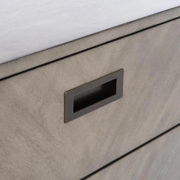 Mid Century chic meets contemporary class in this sophisticated Anson 6 Drawer Dresser. The herringbone inspired pattern on Anson’s solid wood frame in a light grey finish with an acacia veneer makes for a look that’s always in vogue. Subtle bronze pulls add a soft, glamorous touch.