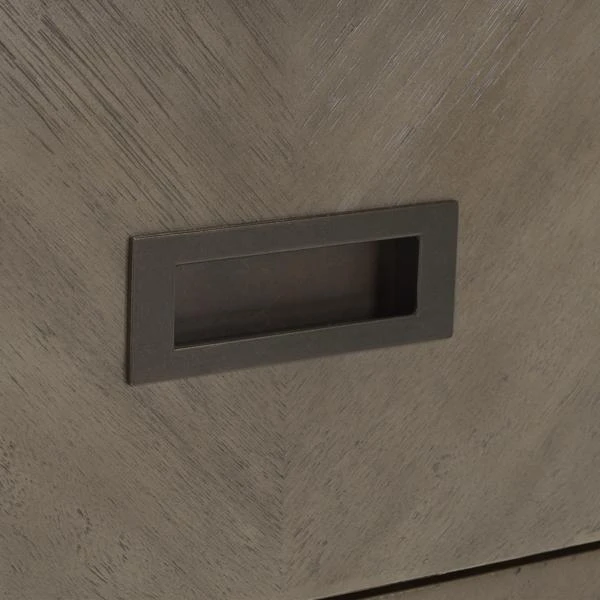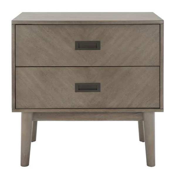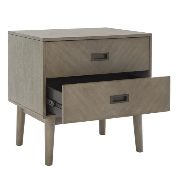 Mid Century chic meets contemporary class in this sophisticated Anson 2 Drawer Nightstand. The herringbone inspired pattern on Anson’s solid wood frame in a light grey finish with an acacia veneer makes for a look that’s always in vogue. Subtle bronze pulls add a soft, glamorous touch.