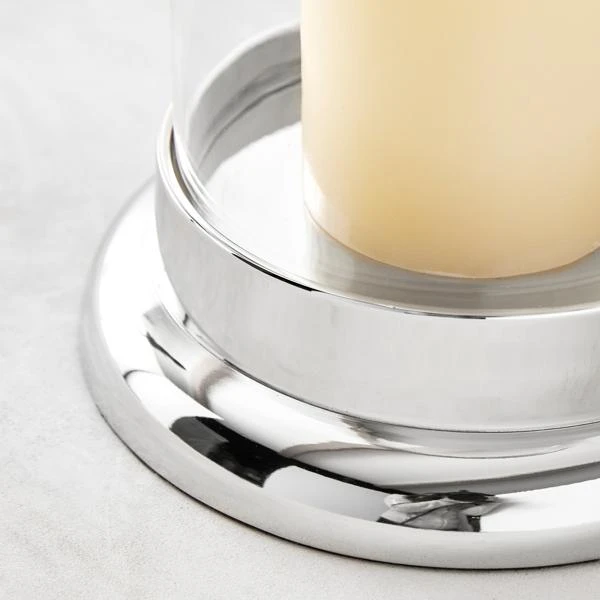 Cast a romantic glow in your home with the addition of candles placed within modern hurricanes. The silver base and trim of the Carter hurricane makes it a very glamorous but neutral piece to blend in any decor.