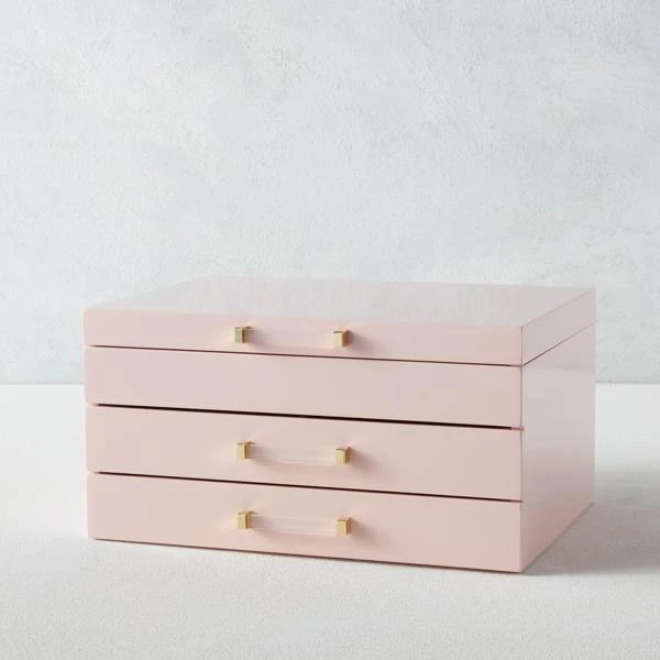 A jewelry box for serious collectors, our largest has two drawers for bracelets and pendants. A top tray features compartments for immediate needs. Clear acrylic handles add a touch of chic style.