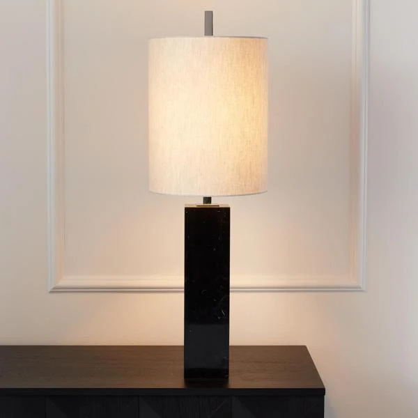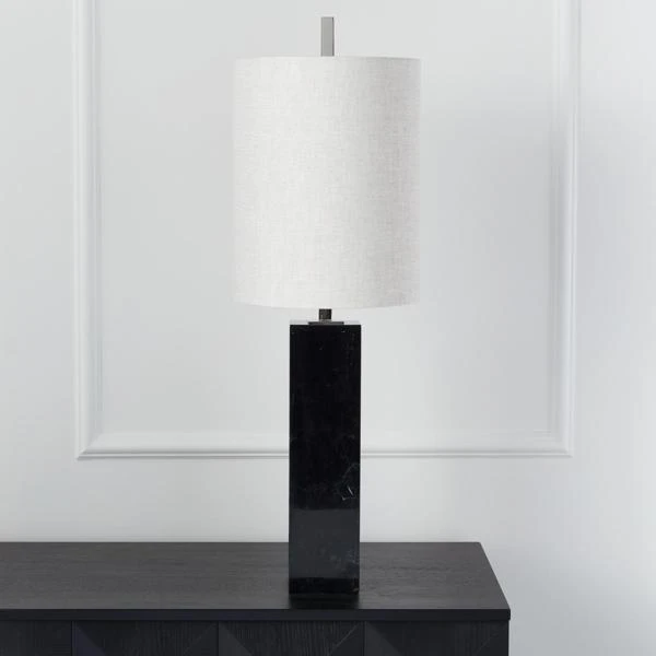 Set below a beige linen drum shade, this table lamp flaunts a naturally stunning marble base with subtle white veining and polished nickel accents.