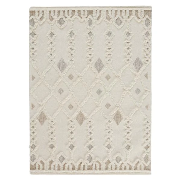 This wool rug features an eye-catching geometric design with a high-low pile that adds texture and visual interest to any space.