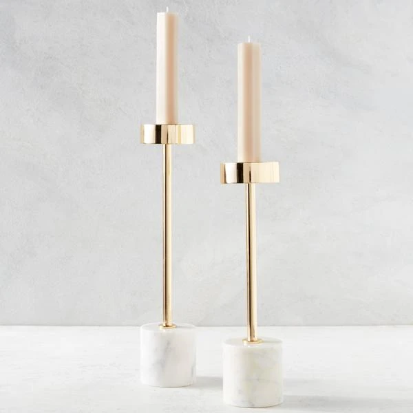 Pairing gold tone metal with white marble, our Greta taper holders make a chic addition to any space.