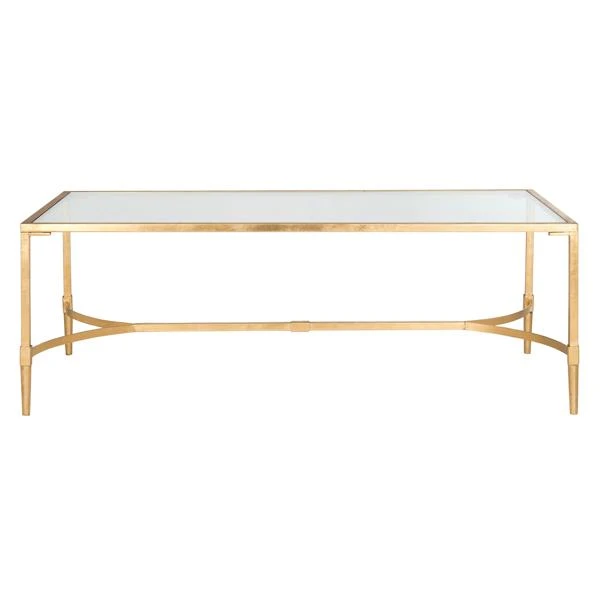 A refined addition to the living room, this coffee table is crafted of iron with an elegantly curved stretcher and hand-applied gold leaf finish. An inset tempered glass top completes the design.