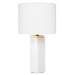 The balanced geometry of a hexagon in a slender white marble column of stunning simplicity, capped in antique brass makes for a perfect accent lamp.