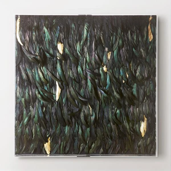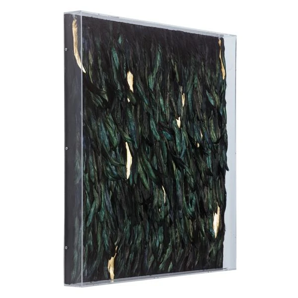 Perfect for adding texture and drama to your wall, this artful arrangement of black feathers is embellished with gold accents and displayed in a clear acrylic shadowbox frame.
