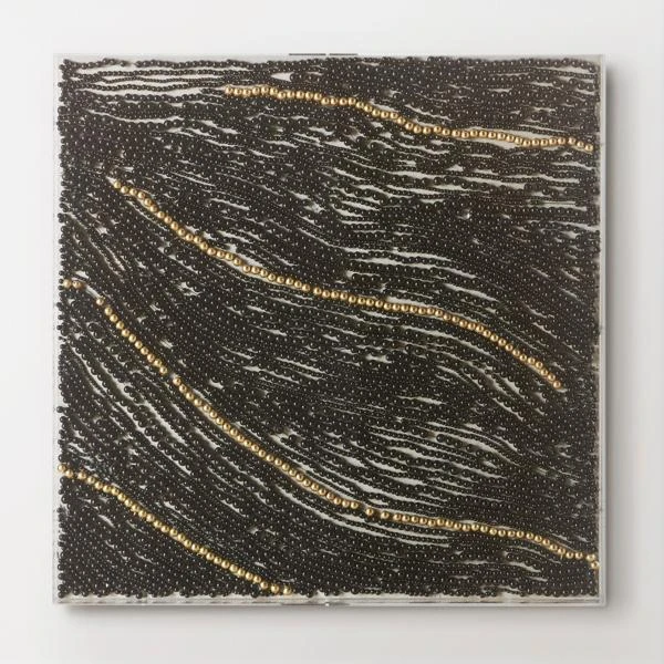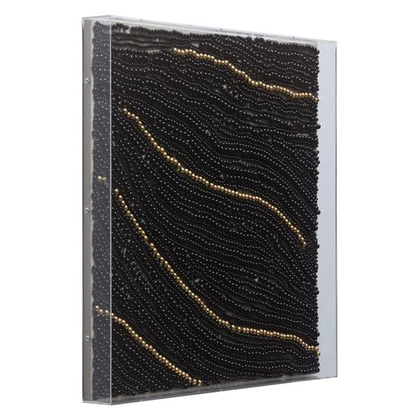 Perfect for adding texture, drama, and shine to your wall, this captivating composition features strands of black and gold beads displayed in a clear acrylic shadowbox frame.