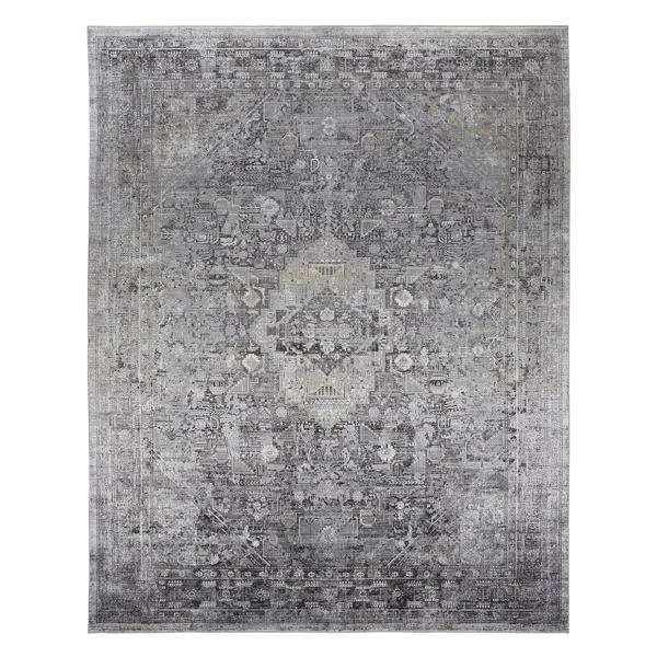 Vintage vibes. Trending cerulean and amethyst weave with deep charcoal and ivory for coveted timeless looks. Power-loomed rug features fine needlework in jacquard construction. Attached fringe makes each piece unique.