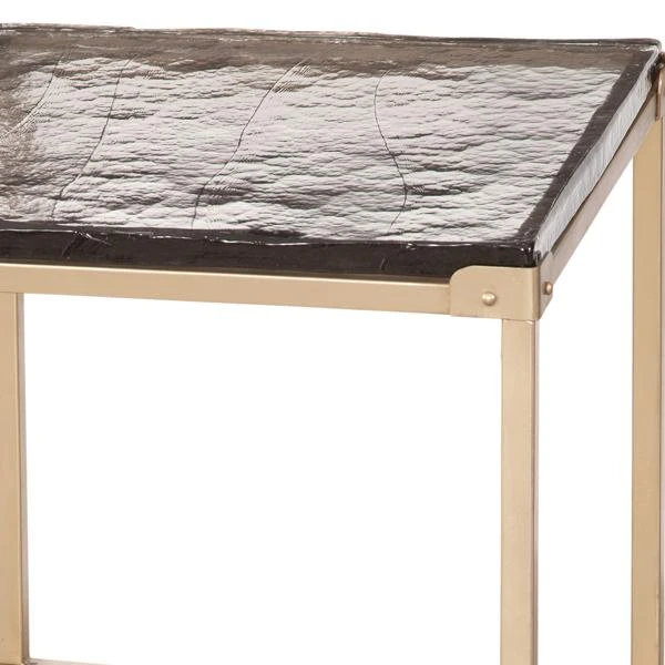 The Livorna End Table table is square featuring a cast glass top surrounded by gold finished metal base. Glass casting is the method in which glass items are made by directing molten glass into a mold where it hardens. This technique has been used since the Egyptian period.