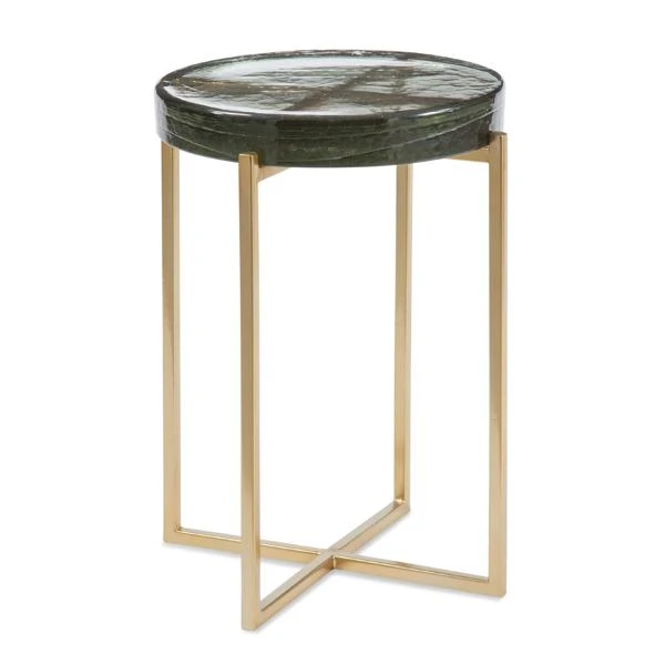 The Livorna Collection features a thick cast glass top surrounded by a gold finished metal base with rivet accents at each corner. Glass casting is the method in which glass items are made by directing molten glass into a mold where it hardens. This technique has been used since the Egyptian period.