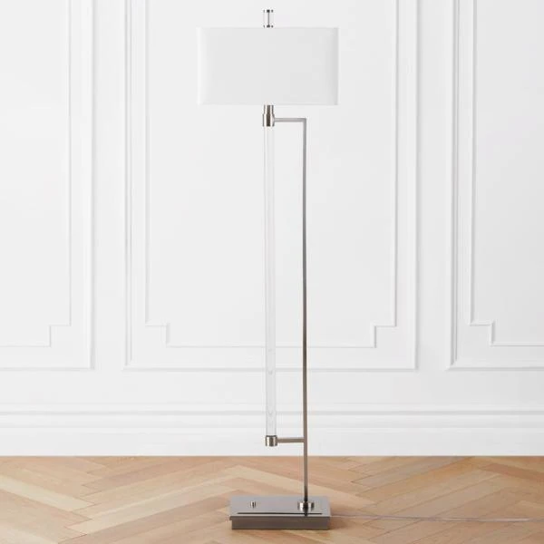 Acrylic accents bring visual energy to a room. Our Maeve Floor Lighting complements modern décor, or offers edge to a more classic space. Maeve’s clear acrylic accent rod is brilliantly juxtaposed against a forged iron, polished nickel plated base and stand. A foot switch allows for easy illumination of filtered light through our white linen shade.