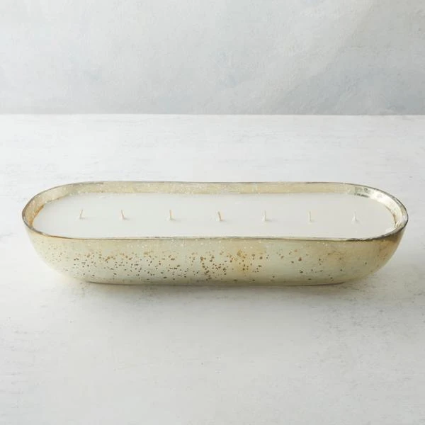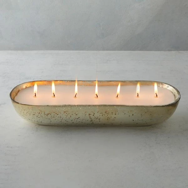 Set in an oblong vessel with a finish redolent of antique mercury-glass design. This unscented seven-wick candle makes a beautiful addition to any decor.