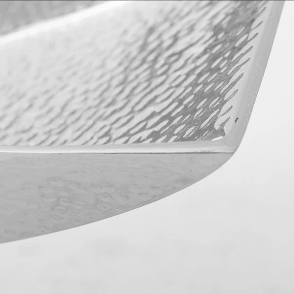 An elegant addition to a console or tabletop display, this centerpiece features an elongated, hammered silver-finished bowl perched on a sleek pedestal base.