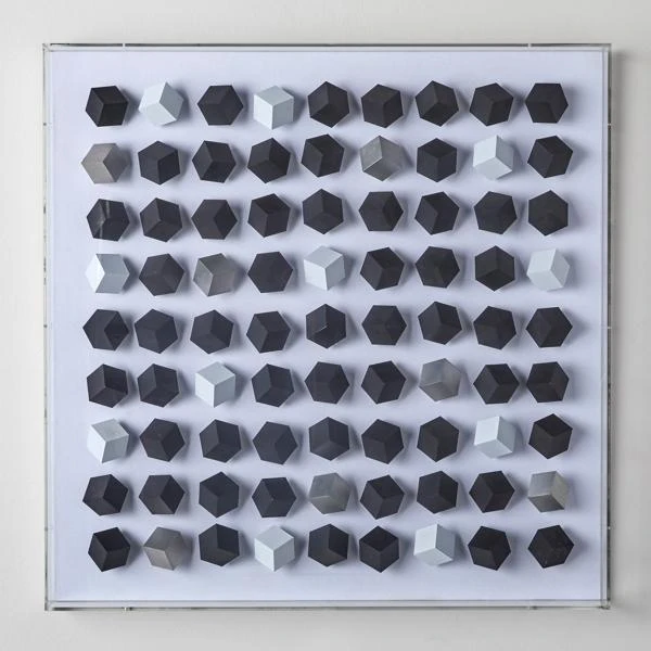 Movement in Squares II is among our most unique pieces. Destined to become a focal point in your home, this creation of silver, white, and black cubes set on a fabric backing in a clear acrylic shadowbox will fascinate guests and start conversations. This wall decor will add modern glamour and sophistication to any space. #2 in a series of 2.