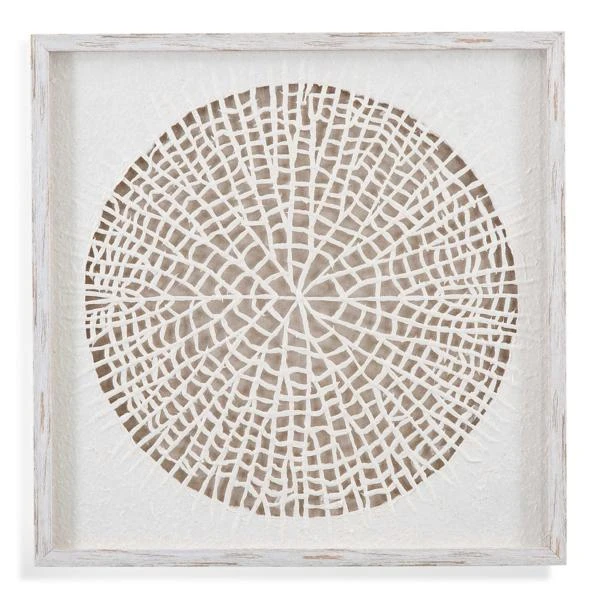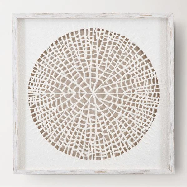 Our Portola Wall Decor is a shadow box accentuated with a light tan silk-like mat and a spiral woven design of white rice paper with a white washed molding. This piece of art is hand painted by a skilled artist lending itself to a unique technique and will vary slightly.