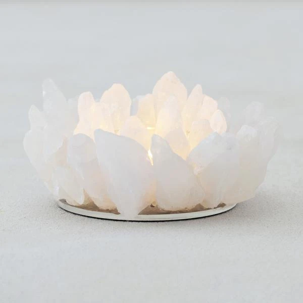 Our White Quartz Crystal tealight holder is made of authentic quartz crystals to create the ultimate in dramatic candlelight. A complex arrangement of the crystals is surrounds a glass cup which holds the candle, emanating light through the semi-transparent quartz for an ethereal ambience.