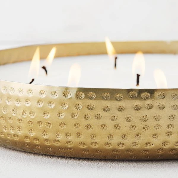 Set in an round vessel with a gold hammered-metal finish. This unscented nine-wick candle makes a beautiful addition to any room.