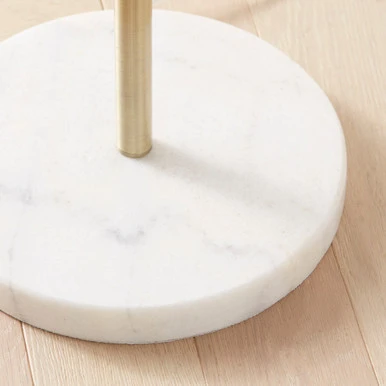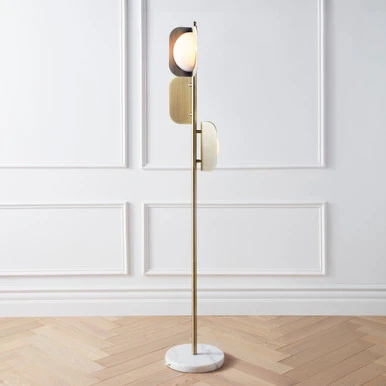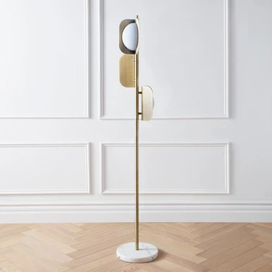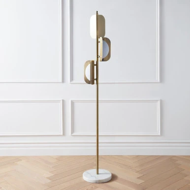 Defined by its sleek, soft-gold-finished frame and frosted acrylic shades, this floor lamp makes a chic statement in any space. A round marble base makes for a refined finishing touch.