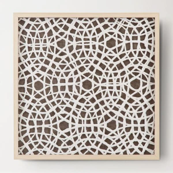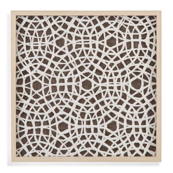 Our Stowe Wall Decor is a shadow box accentuated with a rice paper-like brown mat and a circular radiating pattern of woven white rattan with a natural blonde molding. This piece of art  is hand painted by a skilled artist lending itself to a unique technique and will vary slightly.