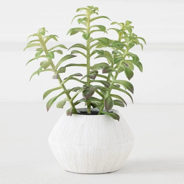 A visually stunning faux arrangement featuring tree succulents elegantly arranged in a white ceramic planter.