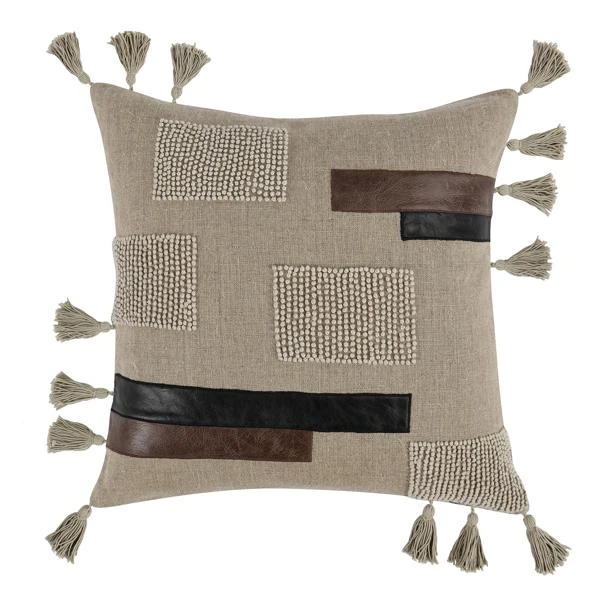 The Zayn pillow is a handcrafted pillow that seamlessly blends various neutral tones, textures, and fabrics to create a captivating and harmonious design. Featuring individually applied pieces of leather and hand-knotted embroidery, this geometrically-sound pillow will elevates any living space. The soft feather blend insert also provides a luxurious supportive feel.